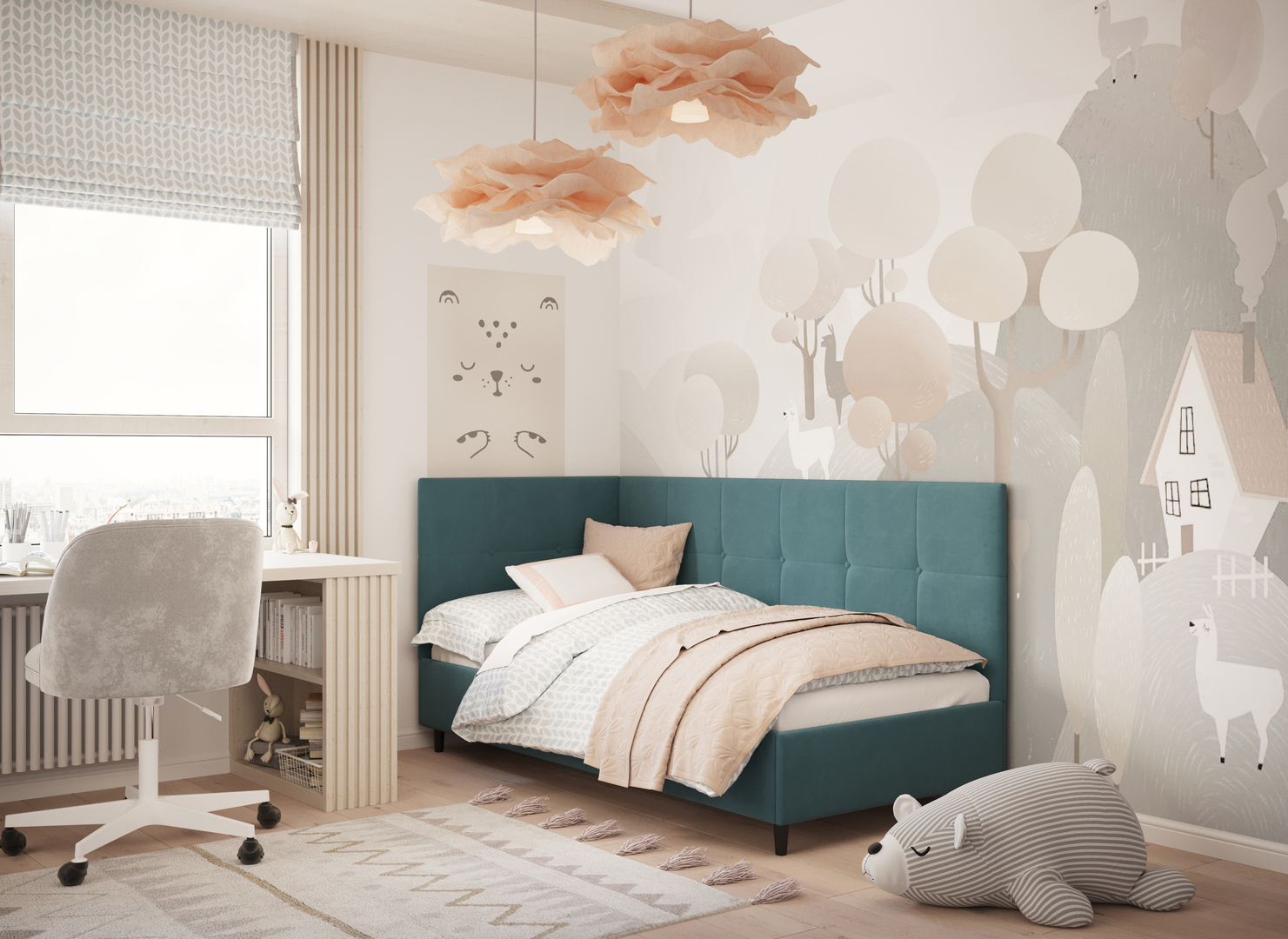 Угловая односпальная кровать MOON FAMILY 1261 с мягкой спинкой и изголовьем создаст в Вашей спальне ощущение уюта. Крупная квадратная стежка привносит в интерьер графических акцентов, а вставка из пуговиц наполняет пространство ощущением домашнего тепла.