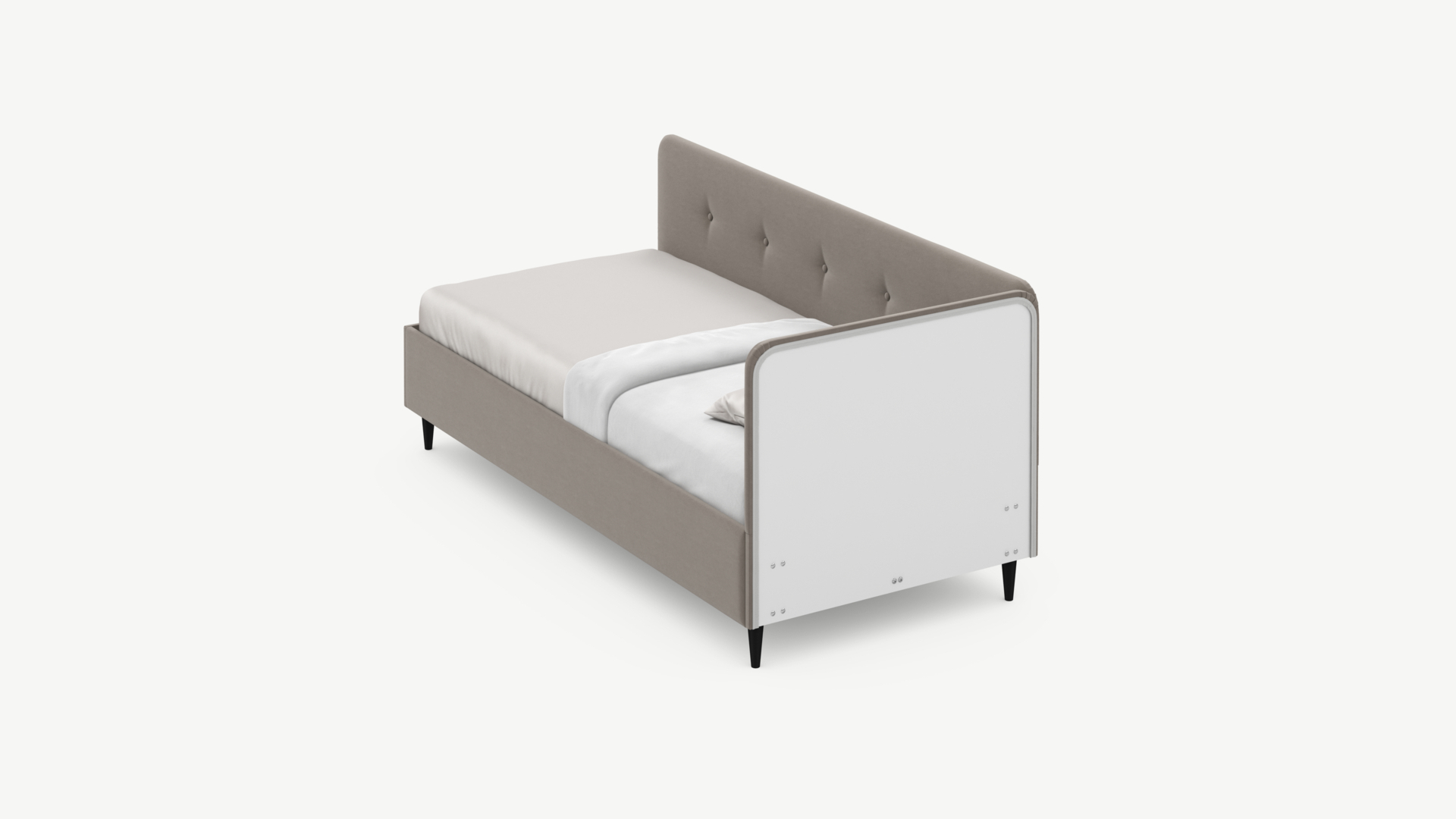 Угловая односпальная кровать MOON FAMILY 1253 с мягкой спинкой и изголовьем обладает округлыми формами, привносящими в интерьер нотки нежности. Изголовье, украшенное пуговицами, добавляет окружающему пространству шарм и уют. Высокие опоры придают кровати визуальной легкости, а также обеспечивают удобство во время уборки.